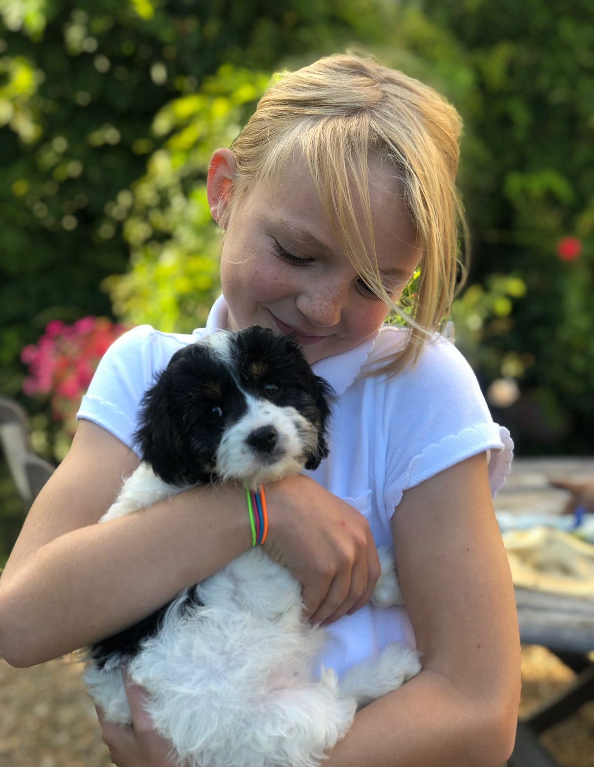Her blossoming friendship with our black and white kitten.